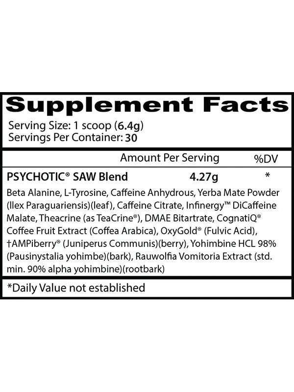 Es el preentrenamiento más LOCO jamás realizado por Mad Chemist y su equipo en Insane Labz. ¡Han empaquetado la fórmula LLENA de ingredientes que trabajan juntos para brindarte todo lo que necesitas para MATAR en el gimnasio! A continuación, amplía cada uno de estos ingredientes para saber qué hace que Psychotic SAW sea diferente a cualquier preentrenamiento que hayas probado.